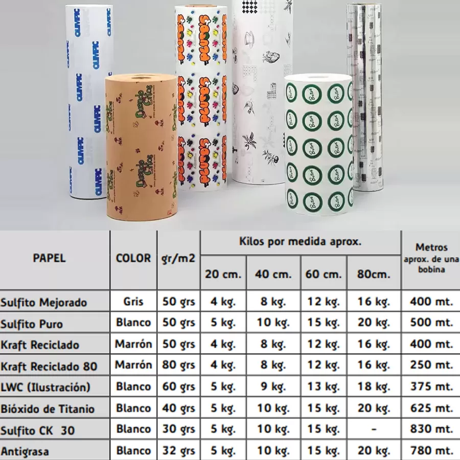 Fabricamos bobinas de papel de una amplia variedad de materiales, colores y gramajes. Desde sulfito mejorado y sulfito puro hasta kraft reciclado, bioxido de titanio y antigrasa. también trabajamos con parafinados o laminados con aluminio.